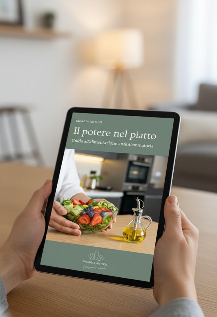Sono la Dott.ssa Giorgia Antoni, Specialista in Scienza dell’Alimentazione ed esperta in nutrizione consapevole, ho creato per te “Il Potere nel Piatto“, una guida essenziale e pratica che ti accompagnerà passo dopo passo nel mondo dell’alimentazione antinfiammatoria.